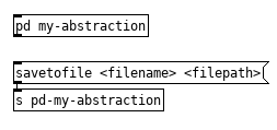 But any existing instance of that abstraction in main.pd will fail to load since the subpatch will not be saved before the patch is loaded. You might be able to make that work with [iemguts/initbang] but not sure, if it does work you would have to pay attention to creation order, the subpatch would have to be created before any instance of the abstraction. You would also want to make use of [file] to check to see if the file already exists/guard against accidental overwriting of files, etc. There are few good uses of this and it should generally be avoided. -